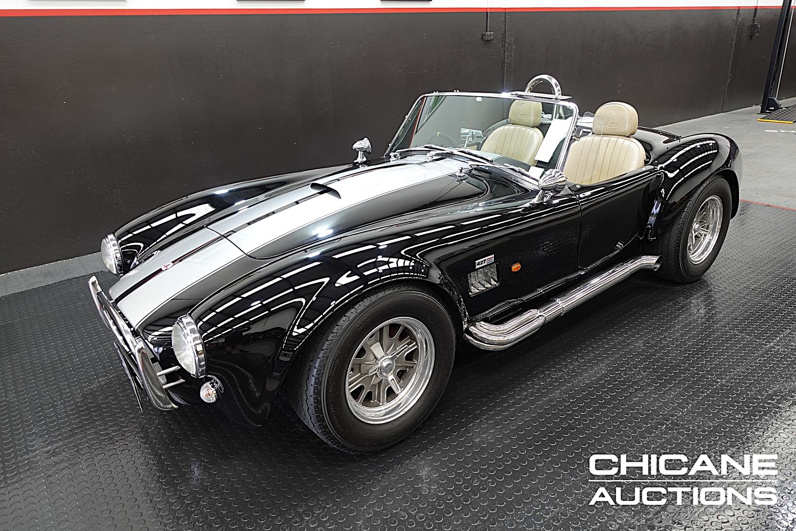 Finished in deep gloss black with iconic silver Le Mans stripes, this Cobra presents with exceptional visual impact. Chrome work throughout is bright and detailed, contrasting beautifully against the dark paintwork, while the stance is purposeful and aggressive courtesy of large Halibrand-style wheels wrapped in high quality Avon tyres.