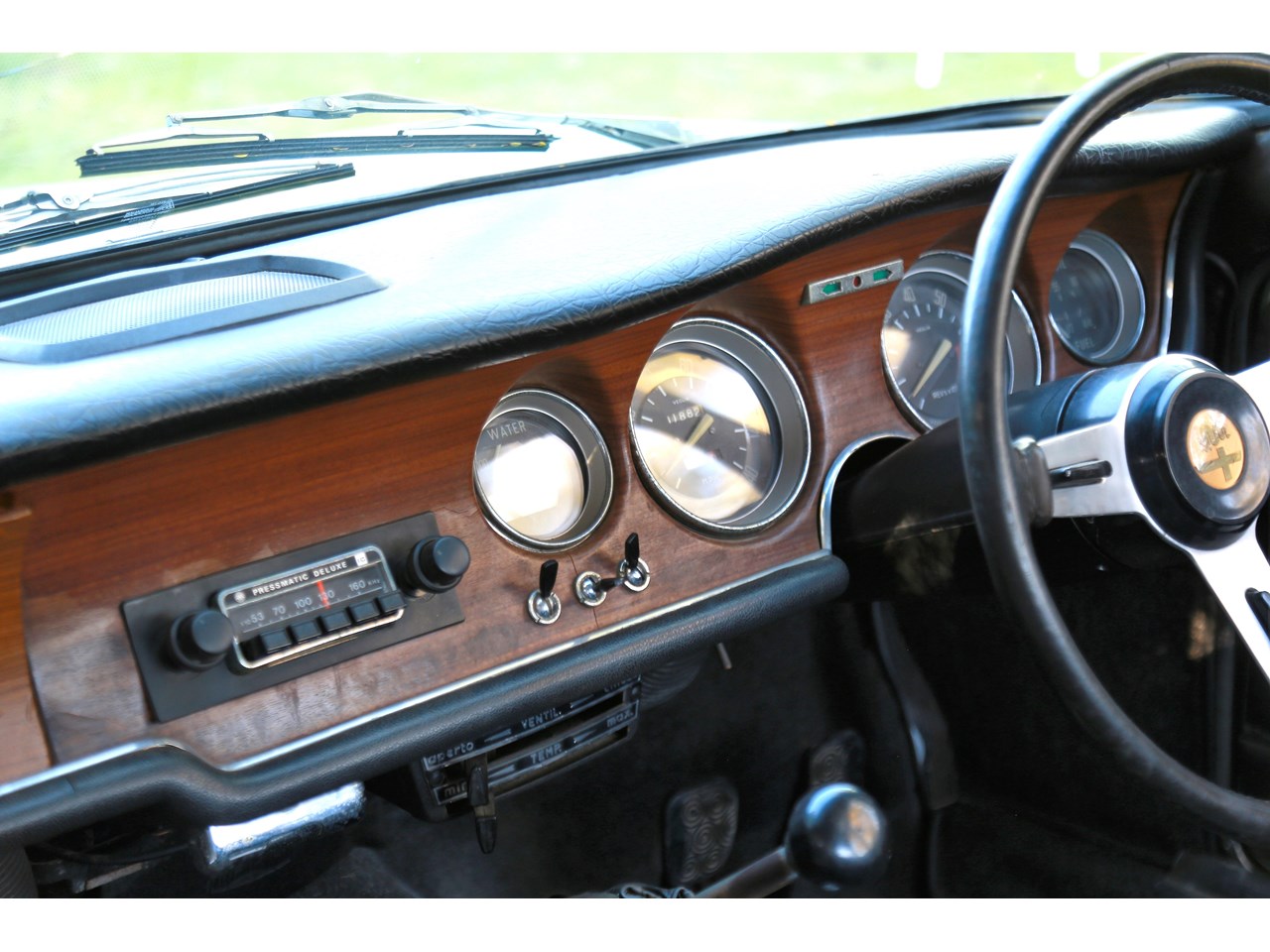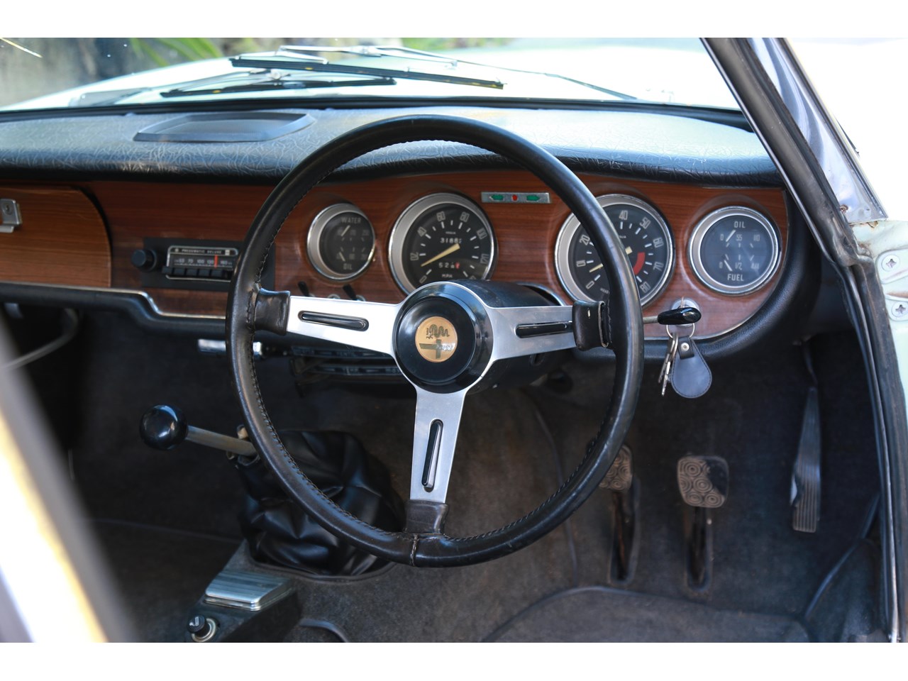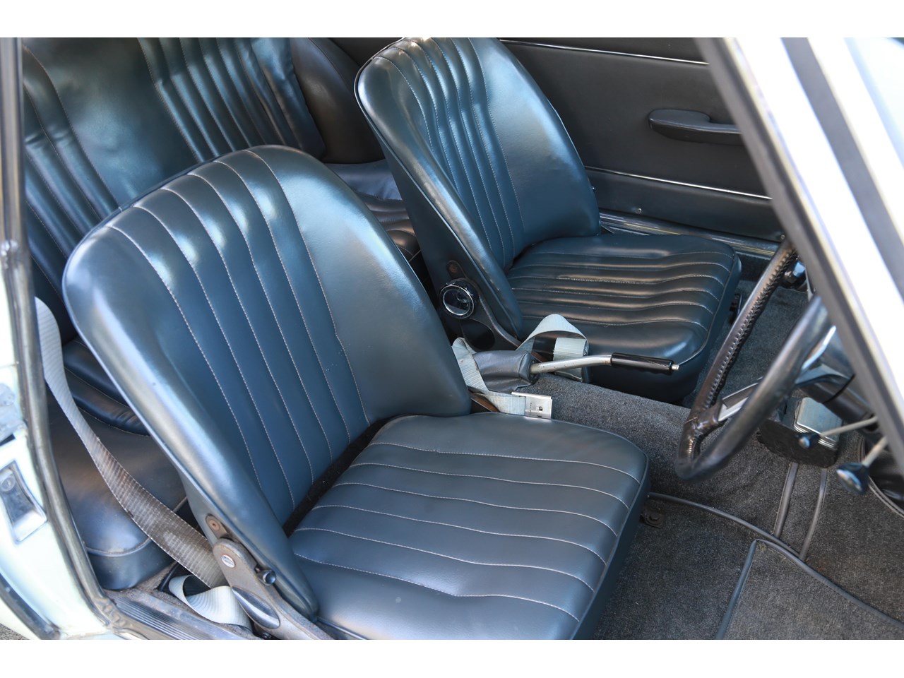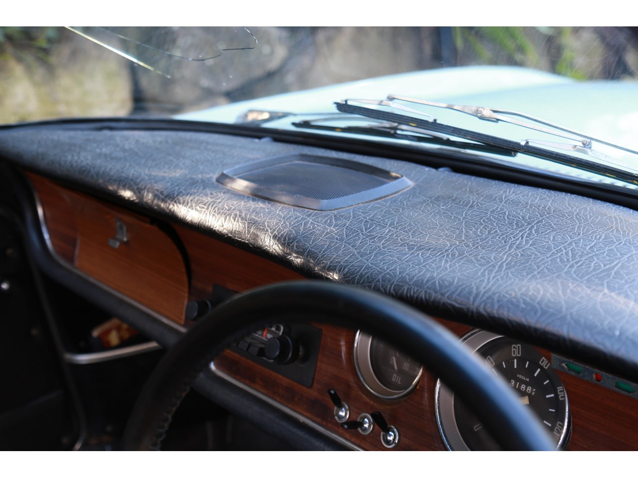 Once inside, the cabin feels light and airy and a nice place to be. The dashboard top is without any cracking and gauges remarkably clear suggesting this has not seen much exposure to sun light. The seats are still covered in the original dark blue/grey vinyl and the only point of cracking is seen on the top of the passenger seat and some minor parting on the seams which could be repaired. The wood effect on the dash facing does have some minor cracking and the glove box has been recovered in the timber effect vinyl and could be better done. The door cards are near perfect. Having said this the interior is incredibly original with patina and charming for it.