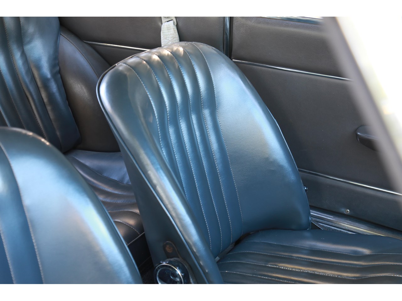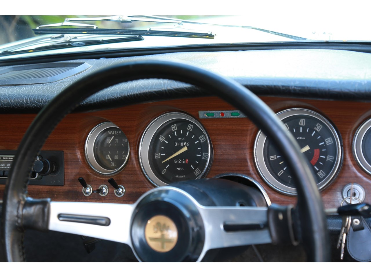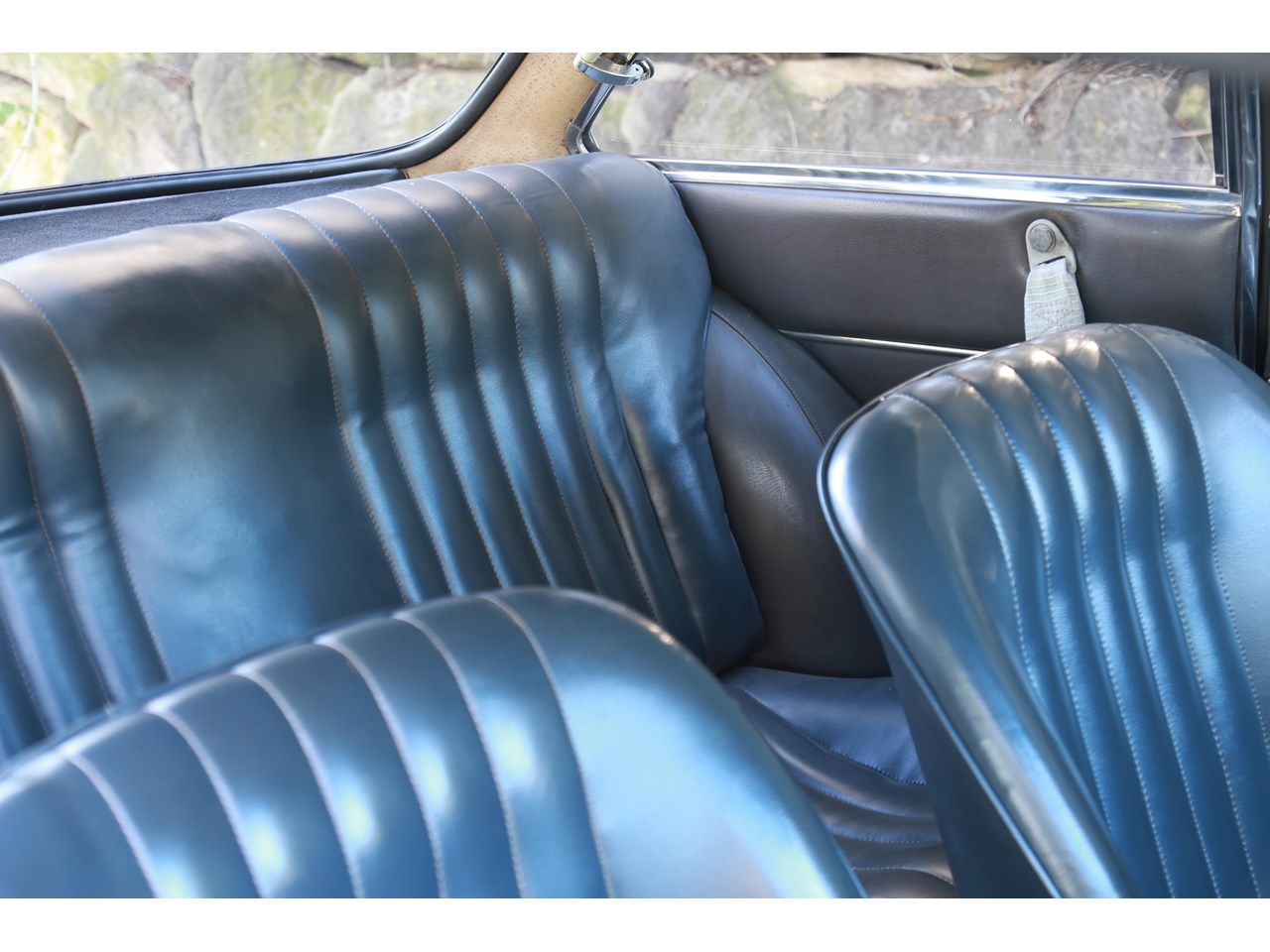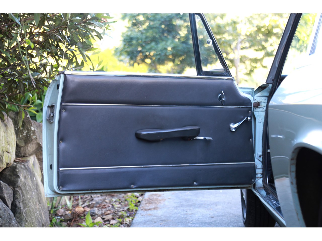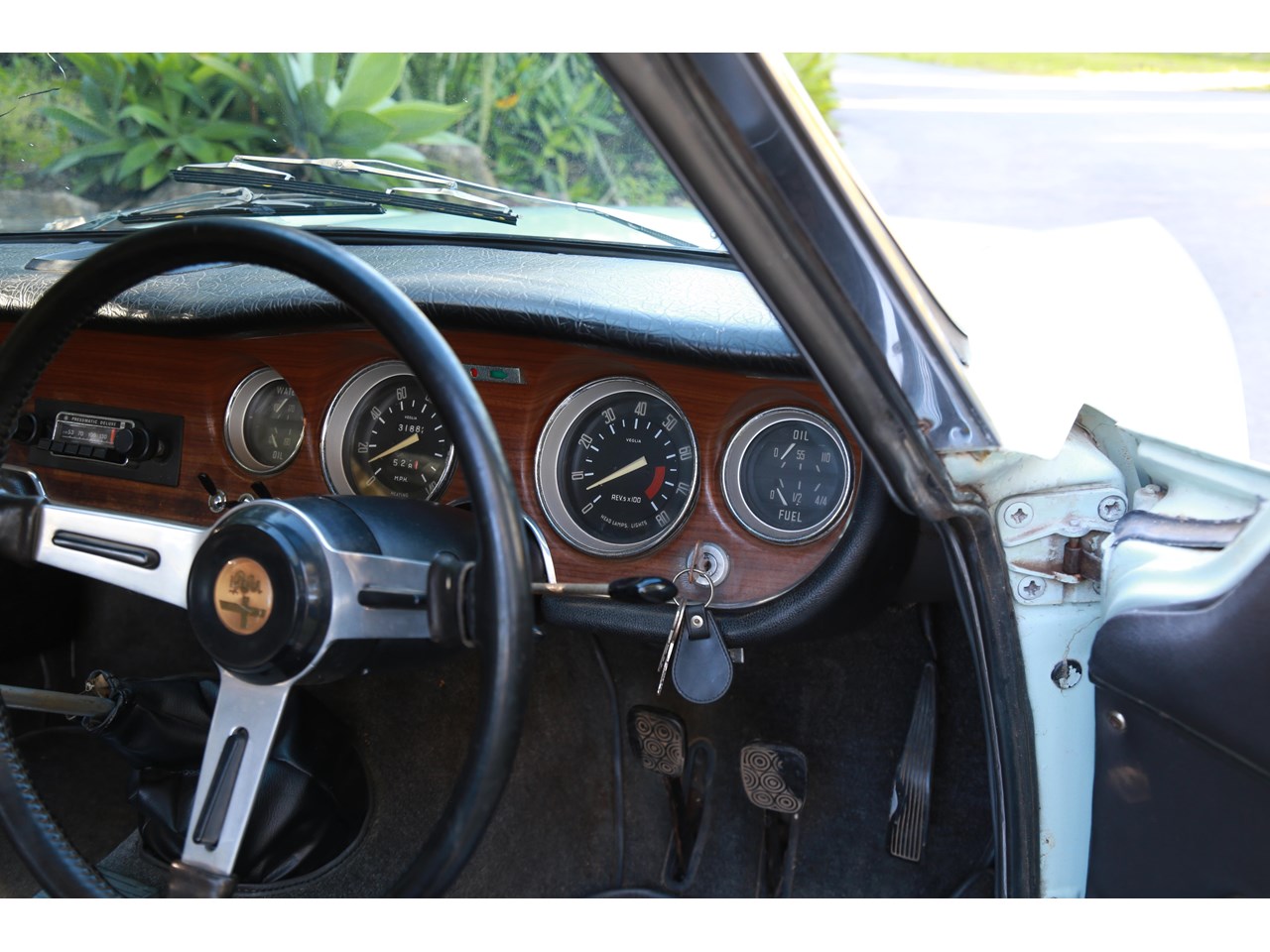 Once inside, the cabin feels light and airy and a nice place to be. The dashboard top is without any cracking and gauges remarkably clear suggesting this has not seen much exposure to sun light. The seats are still covered in the original dark blue/grey vinyl and the only point of cracking is seen on the top of the passenger seat and some minor parting on the seams which could be repaired. The wood effect on the dash facing does have some minor cracking and the glove box has been recovered in the timber effect vinyl and could be better done. The door cards are near perfect. Having said this the interior is incredibly original with patina and charming for it.