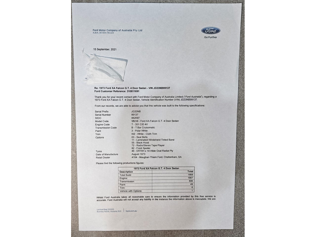 According to the Ford Verification letter, this XA GT is one of 1,868 built, one of 806 with the same transmission, one of 49 with the Polar White paint, one of 6 with the W2 trim and One of One with the exact build.
