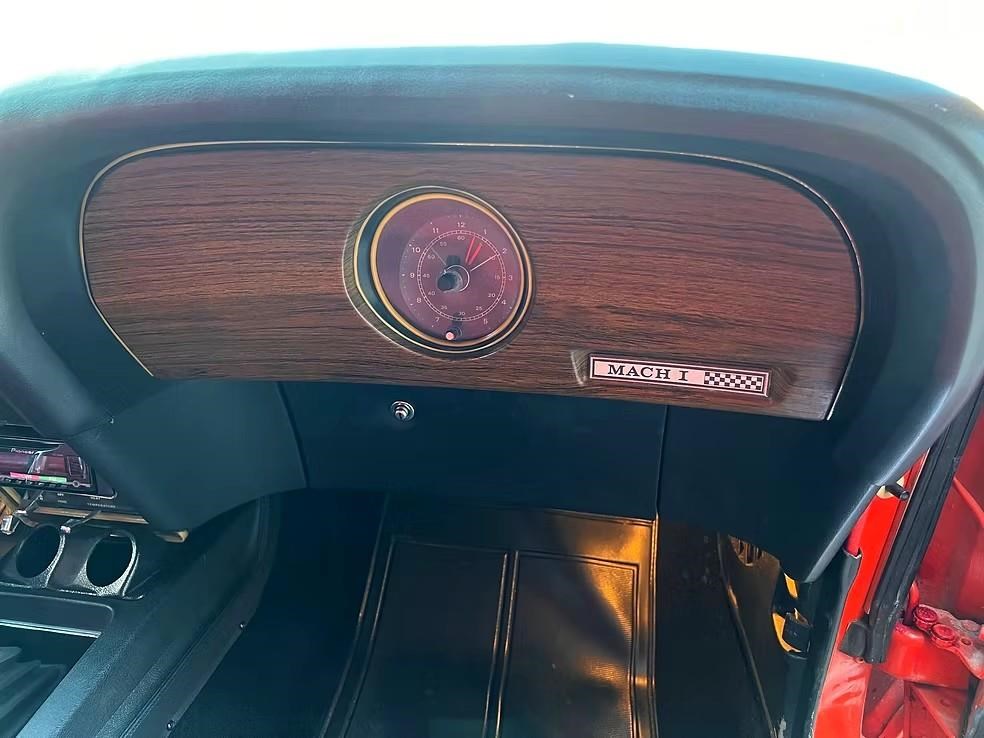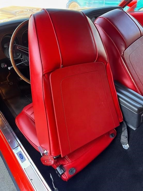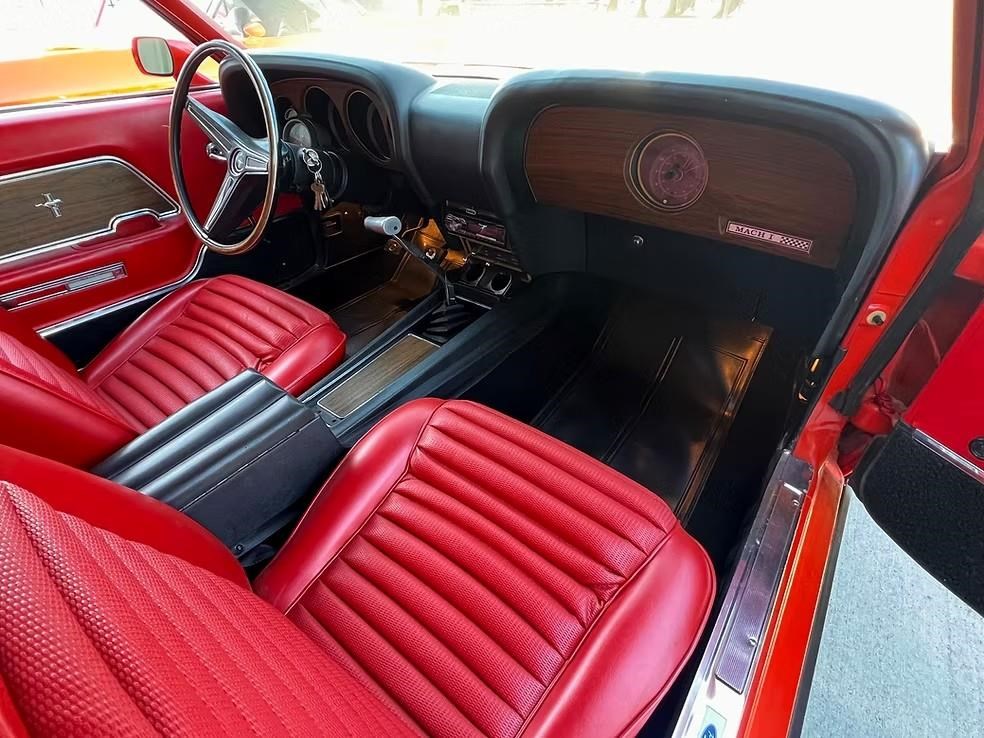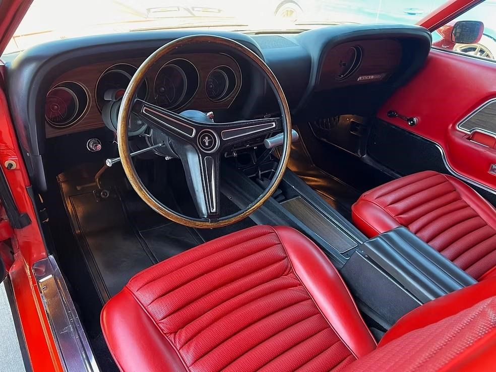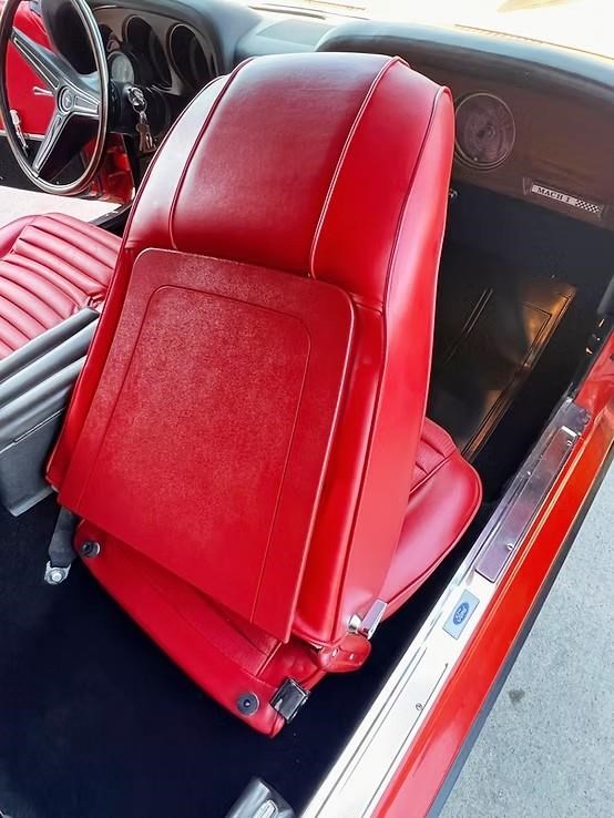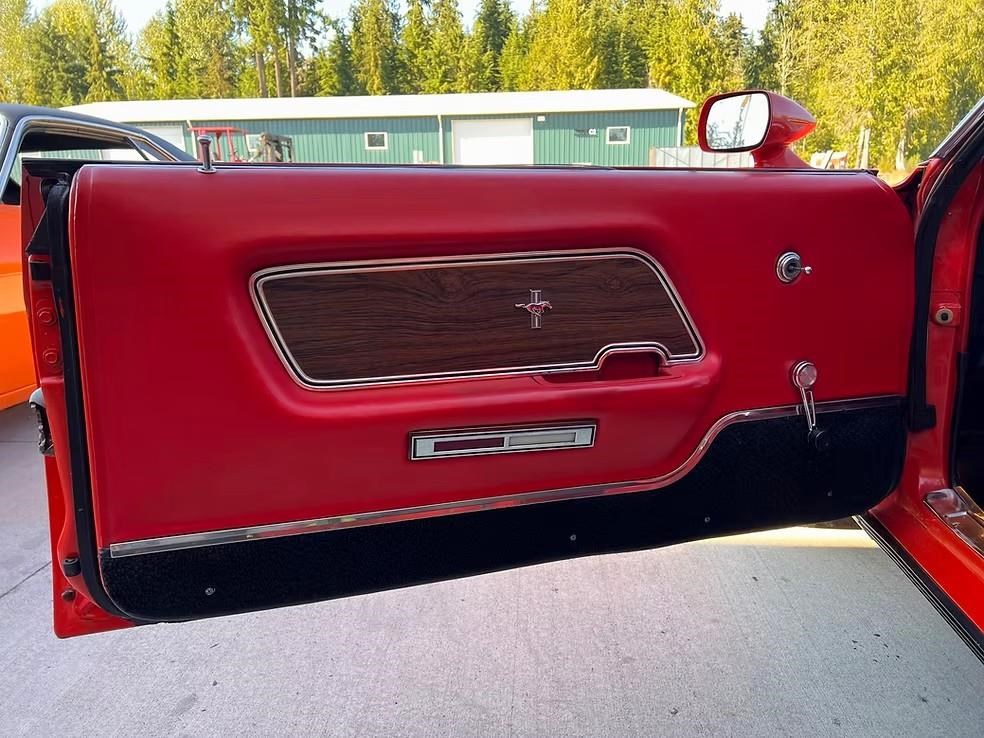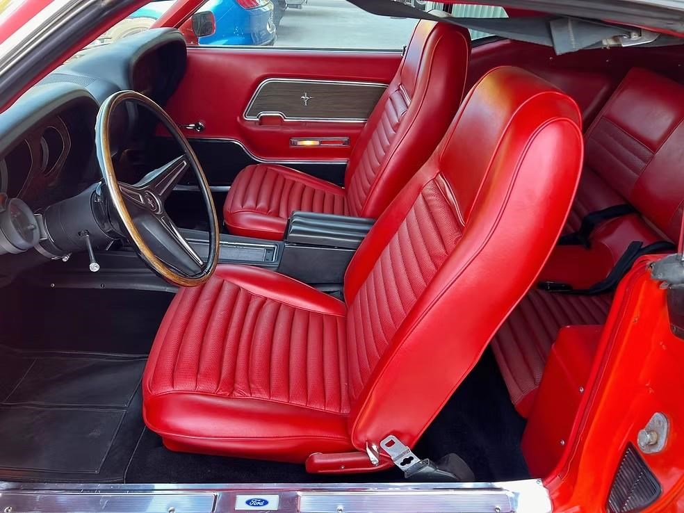 The car has been refinished in its striking factory correct colour of Calypso Coral and features the factory black hood stripe option for that aggressive curb appeal. The brightwork, trim, and glass present very well. The floorplans also have been replaced as part of the refurb. The factory-correct Vermilion Red interior has also been previously restored. The car has that classic Mustang feel buckets, floor shifter, and clean presentation throughout.