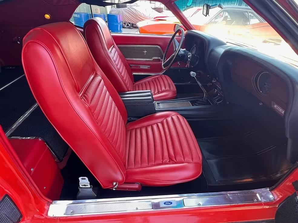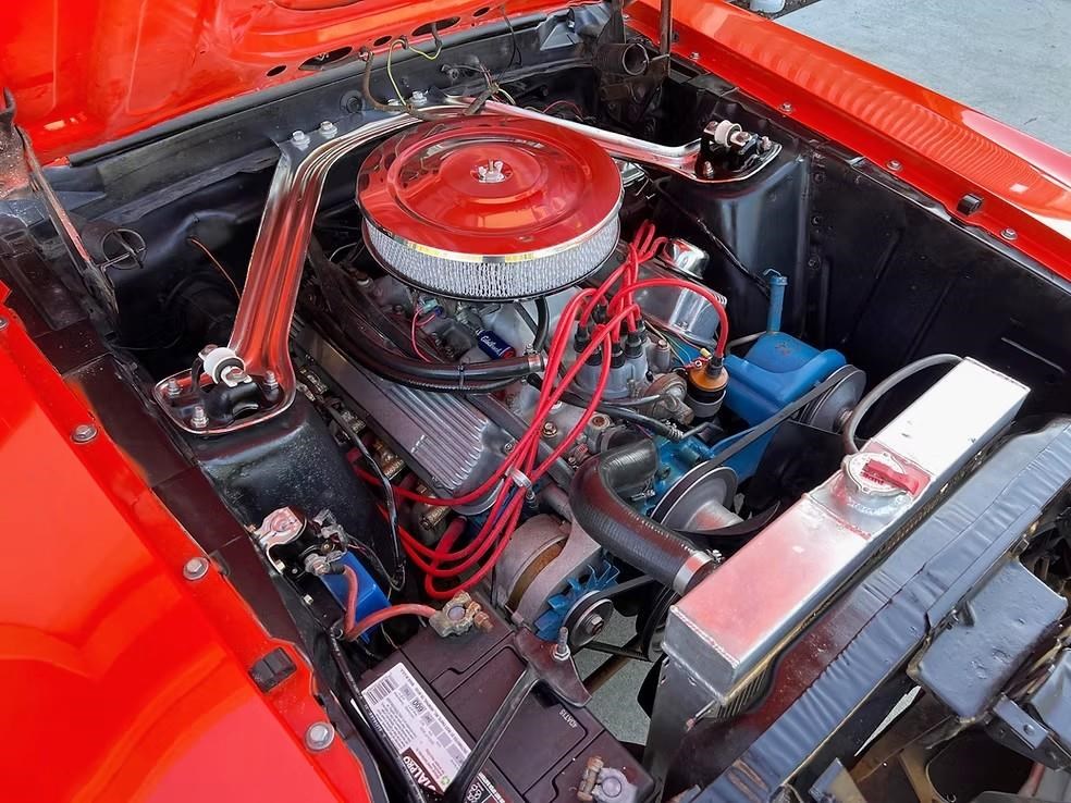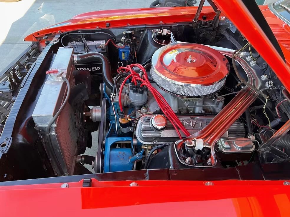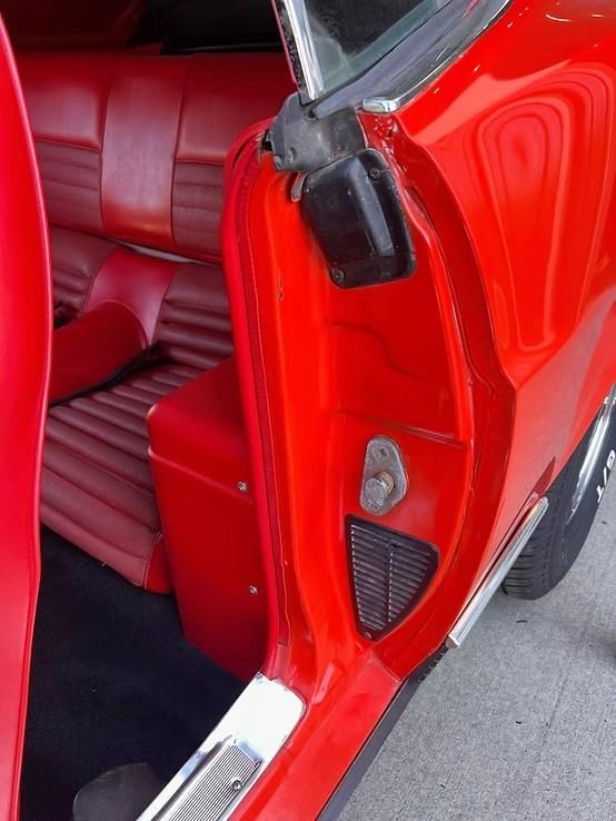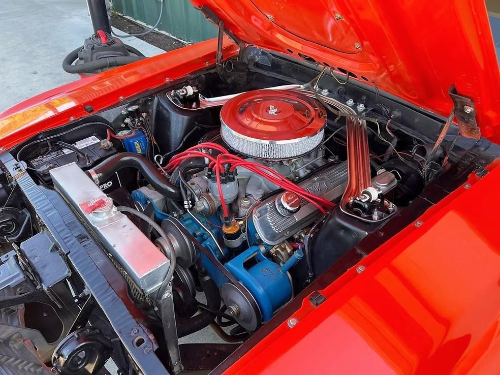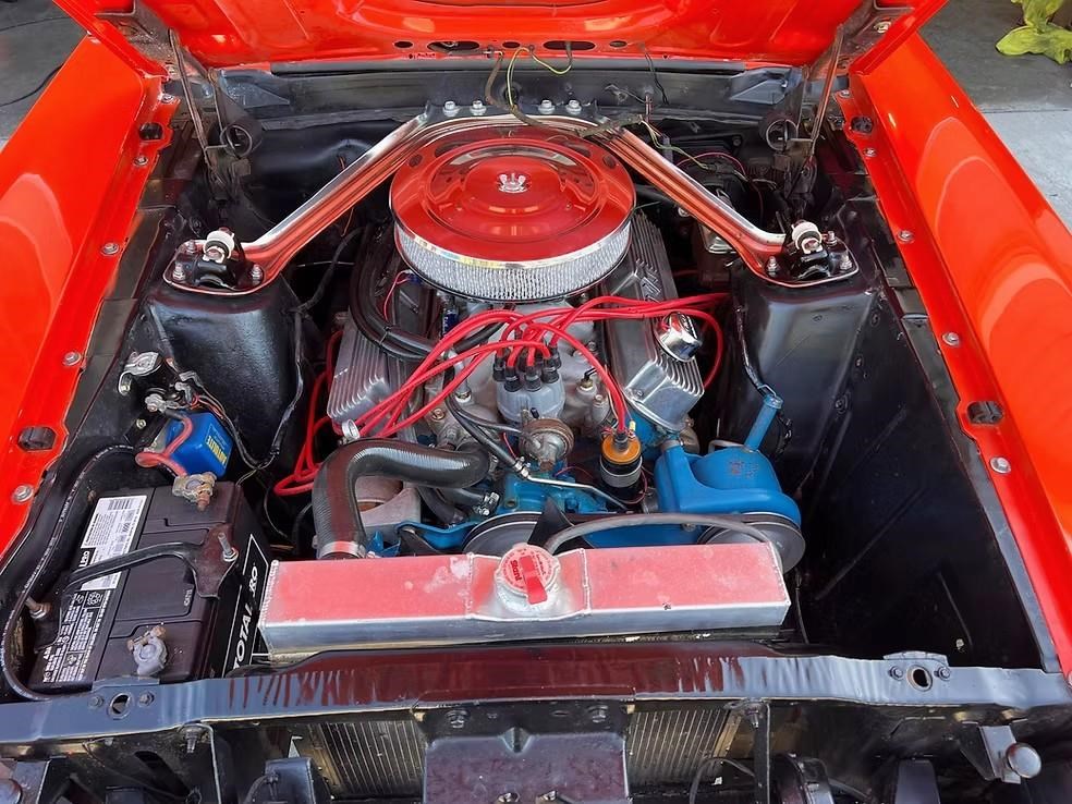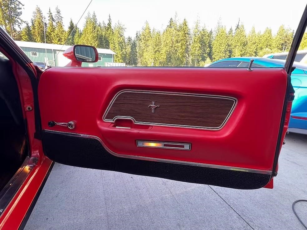 The car has been refinished in its striking factory correct colour of Calypso Coral and features the factory black hood stripe option for that aggressive curb appeal. The brightwork, trim, and glass present very well. The floorplans also have been replaced as part of the refurb. The factory-correct Vermilion Red interior has also been previously restored. The car has that classic Mustang feel buckets, floor shifter, and clean presentation throughout.