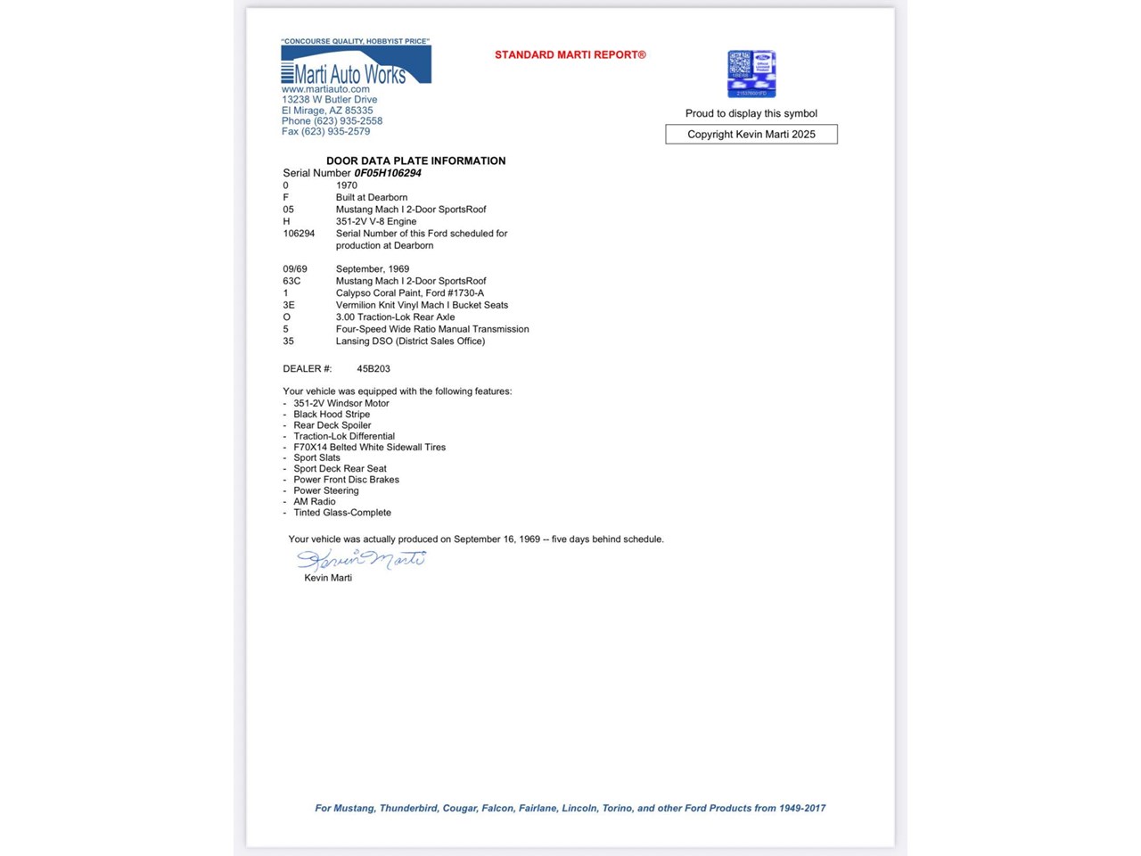 Make no mistake this Mach 1 is backed by a Marti Report showing that this is a true factory 05-code Mach 1 Mustang not a clone, not a tribute!