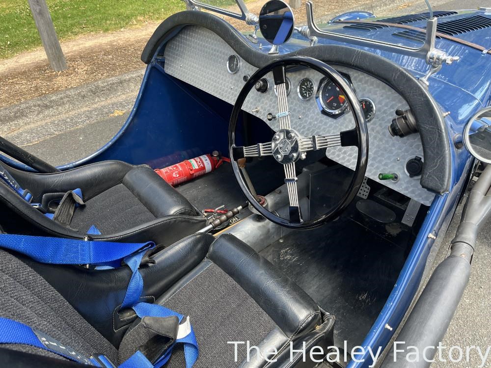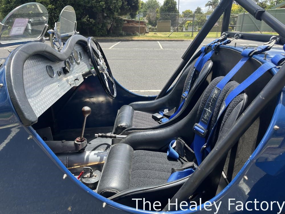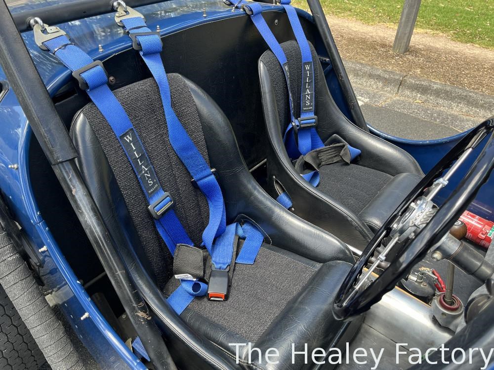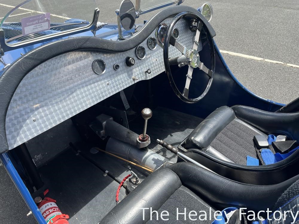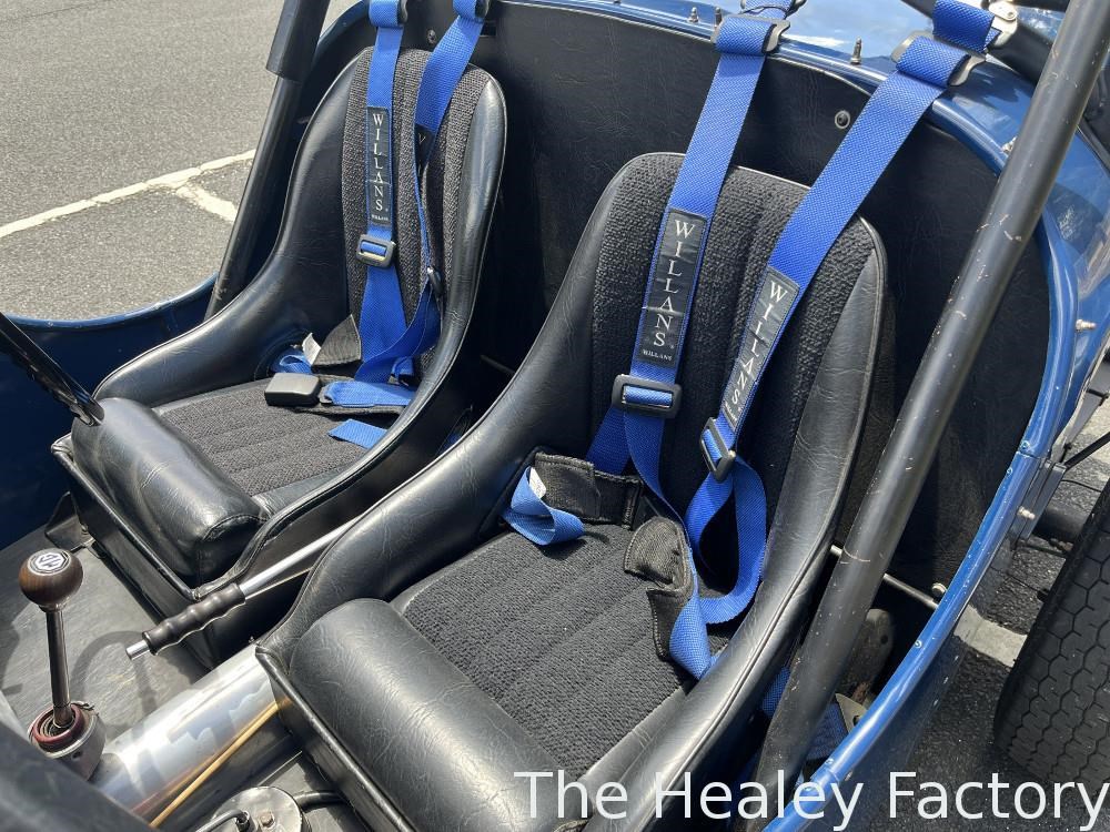 Cockpit: Twin bucket seats, 4 point 3" Willans race harness, full width CAMS approved rollbar, Bluemels Brooklands steering wheel, custom turned aluminium dashboard.
