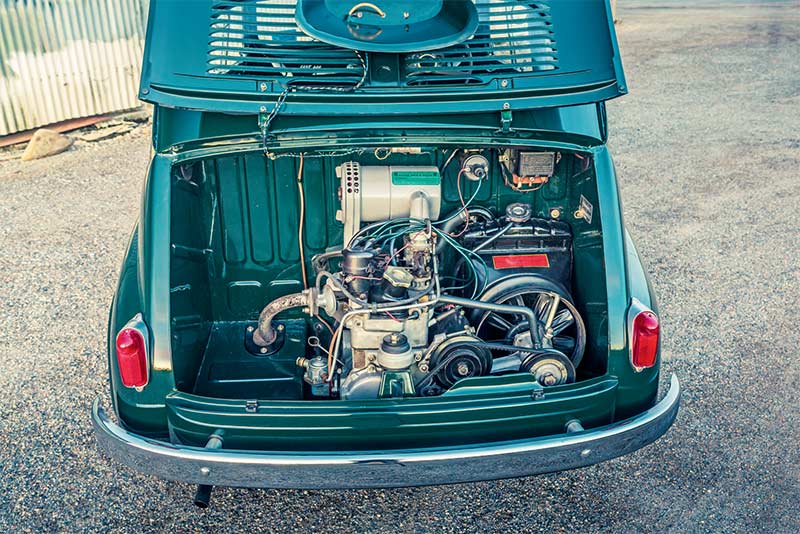 The overall length was almost identical, at about 10 feet six inches, but where the Topolino tipped the scales at 610 kilograms, the cleverly packaged 600 shaved a few kilos off this. Ingenuity abounded. The engine was mounted behind the gearbox to save space and facilitate servicing. The radiator was mounted to the side.
